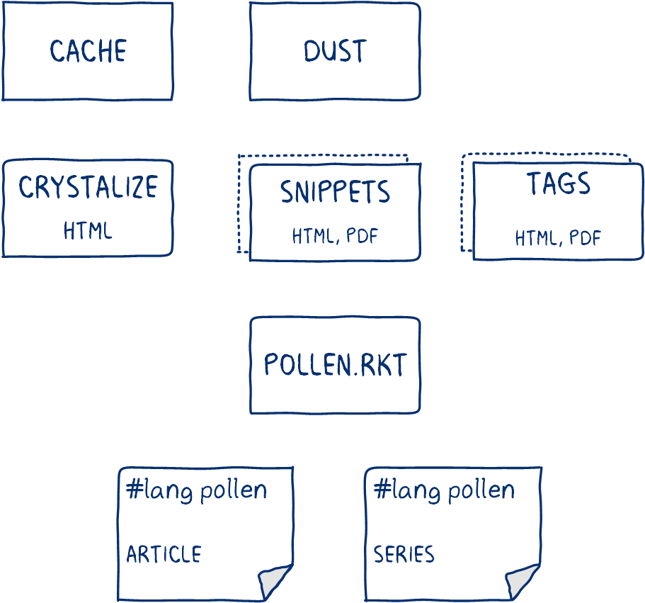 Here’s a rough diagram showing how the .rkt modules in this project relate to each other, and to the Pollen source documents. This is the least complex system I could devise that would A) implement everything I want in my Design Goals, B) cleanly separate dependencies for print and web output, and C) organize an ever-growing collection of hundreds of individual notes and articles without noticable loss of speed.